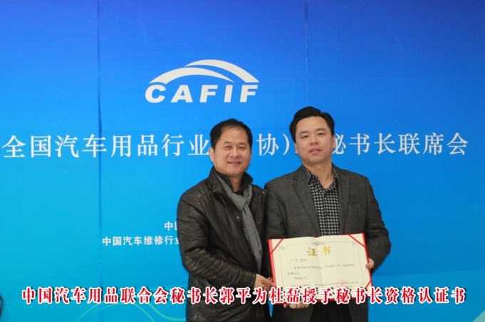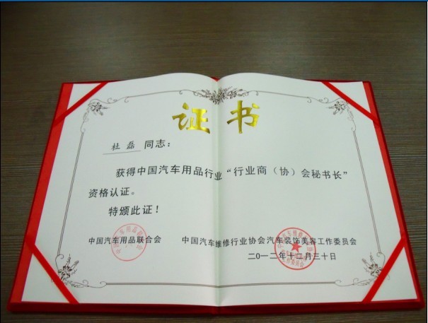 2012年12月30日,在武漢舉辦的全國汽車用品商協(xié)會秘書長聯(lián)席會上。山東省汽車用品商會杜磊常務副會長榮獲中國汽車用品聯(lián)合會、中國汽車維修行業(yè)協(xié)會汽車裝飾美容工作委員會聯(lián)合頒發(fā)的《中國汽車用品行業(yè)商(協(xié))會秘書長資格認證》證書;肯定了杜會長多年來在汽車用品行業(yè)所作出的貢獻!杜磊發(fā)言中重點提出:山東省汽車用品商會將繼續(xù)為發(fā)展汽車用品行業(yè)而奮斗,做好聯(lián)合會的聯(lián)系工作。