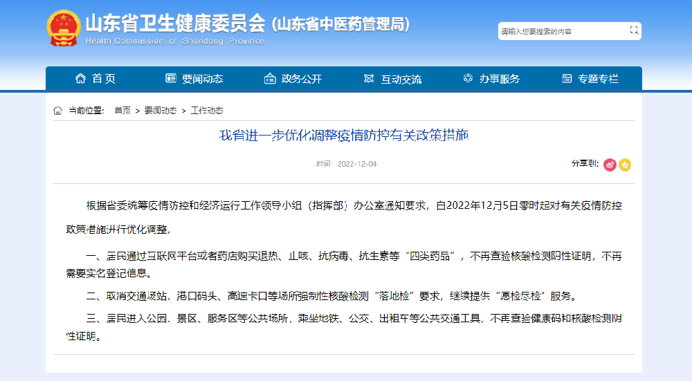 12月4日,山東省衛(wèi)健委發(fā)布消息:根據(jù)省委統(tǒng)籌疫情防控和經(jīng)濟運行工作領(lǐng)導(dǎo)小組(指揮部)辦公室通知要求,自2022年12月5日零時起對有關(guān)疫情防控政策措施進行優(yōu)化···