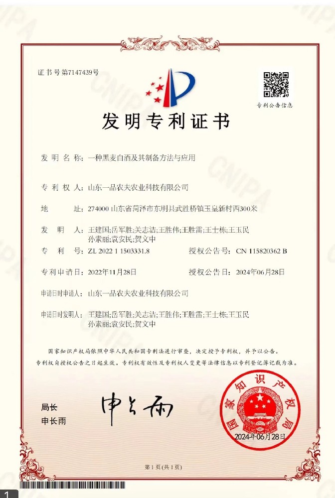 近日,山東一品農(nóng)夫農(nóng)業(yè)科技有限公司“一種黑麥白酒及其制備方法與應(yīng)用”發(fā)明專(zhuān)利獲批(專(zhuān)利號(hào):ZL 2022 1 1503331.8),該公司也成為白酒行業(yè)首家以黑···