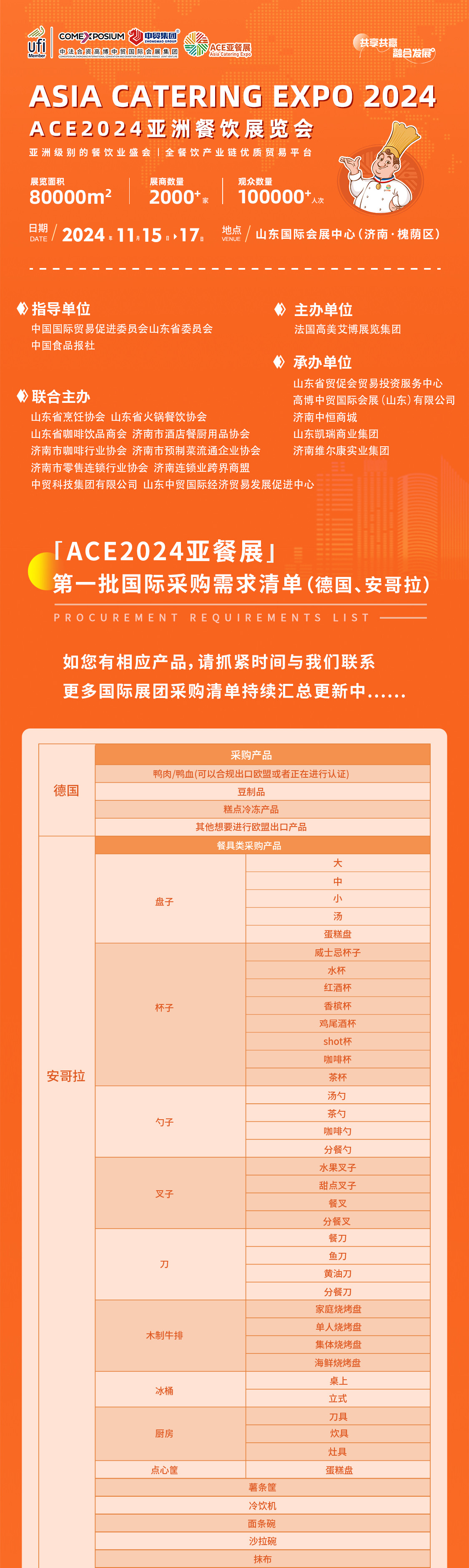 11月15-17日,ACE2024亞餐展將在山東國(guó)際會(huì)展中心(濟(jì)南市槐蔭區(qū))盛大舉辦。如您有拓展國(guó)內(nèi)外餐飲市場(chǎng)或者參觀選品的計(jì)劃,可在評(píng)論區(qū)留言或致電:0531-82350000 0551-67102222咨詢。