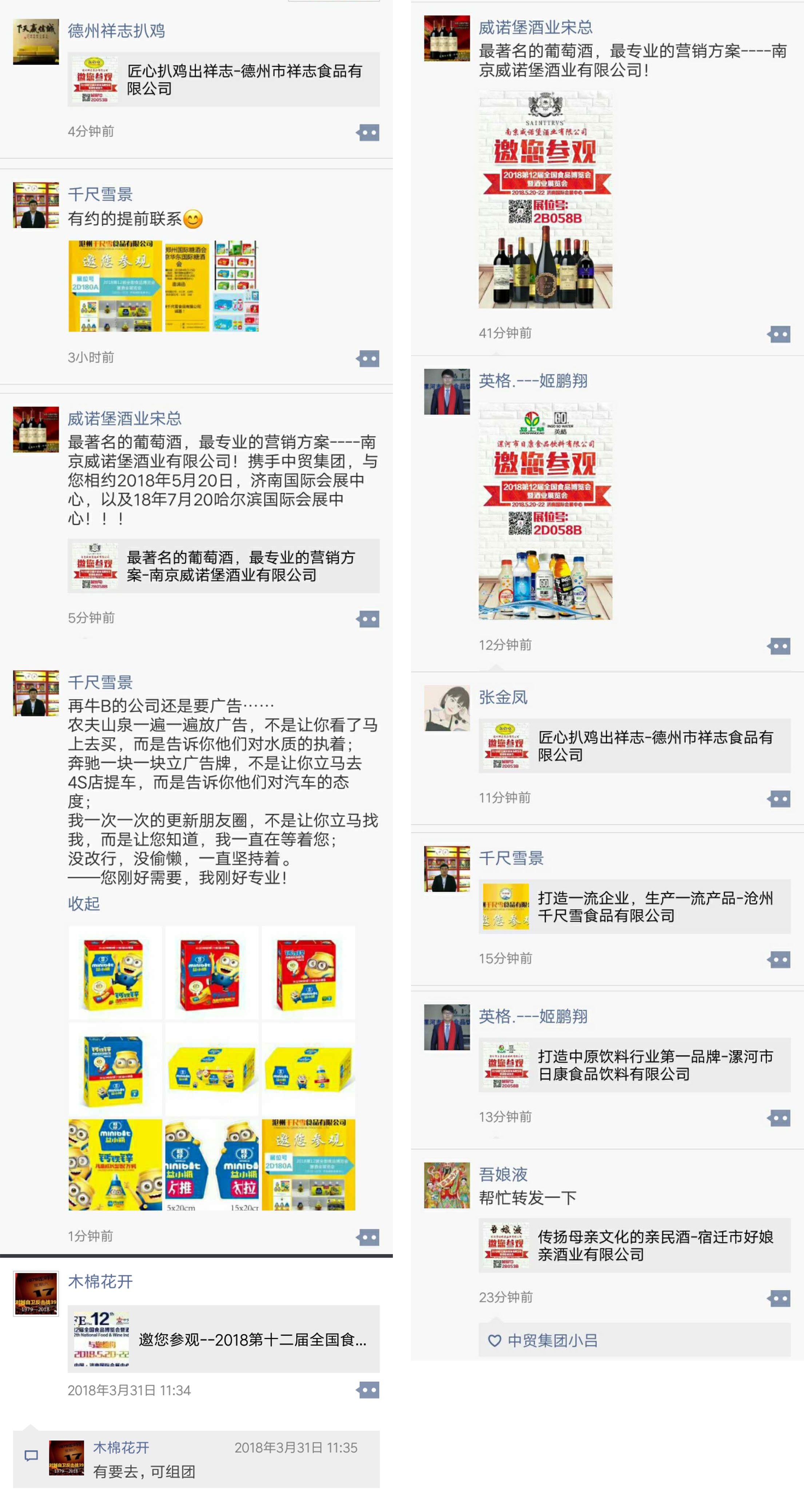 展商宣傳圖,宣傳文案,瘋狂的占據(jù)各個(gè)參展企業(yè)負(fù)責(zé)人的朋友圈,展會(huì)信息潛移默化的影響著每一位經(jīng)銷商,代理商。在各位展商積極的配合宣傳下,報(bào)名人數(shù)與日俱增,接下來會(huì)加大朋友圈的轉(zhuǎn)發(fā)力度,期待2018CNFE的精彩。
