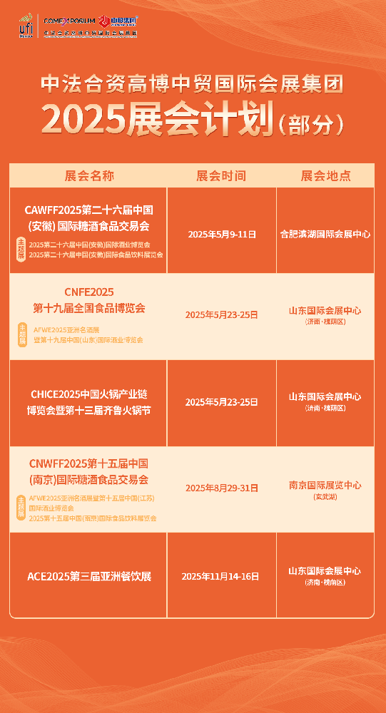 近日,中法合資高博中貿(mào)國際會展集團經(jīng)過科學(xué)論證與研討,確定了旗下部分重要展會的舉辦檔期。其中,CAWFF2025第二十六屆中國 (安徽)國際糖酒食品交易會將于2···